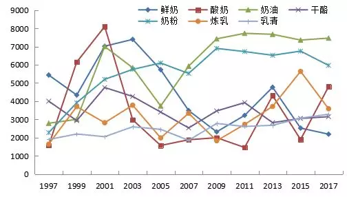 2000年以来奶油是我国进口市场集中度最高的产品,排名前8国家的进口量占总进口量的比重一直在96%以上,超过四分之三年份的比重在99%以上。从奶油的HHI值可以看出,除1997-1999年间低于3000外,2000年以来一直远远高于3000的分界线,意味着奶油进口市场结构由20世纪90年代末的高寡占II型转变为目前的高寡占I型,市场集中度进一步提升。