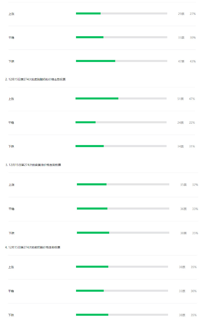 在12月1日第274次拍卖盘前分析中,我们发出了关于全脂奶粉、脱脂奶粉、黄油、奶酪价格走势预测的投票,投票结果如下: