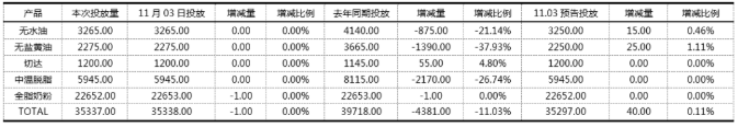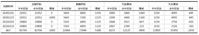 环比投放,基本持平;同比去年,脱脂奶粉+乳脂继续大幅度减量;较上次拍卖预告比较,乳脂微增。
