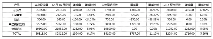 环比投放,由于高峰期已过,所有品种均有所减少;同比去年,全脂奶粉平稳,其他产品降幅较大;较上次拍卖预告比较,无水油投放剧减,黄油投放微增,全脂奶粉有所减少。