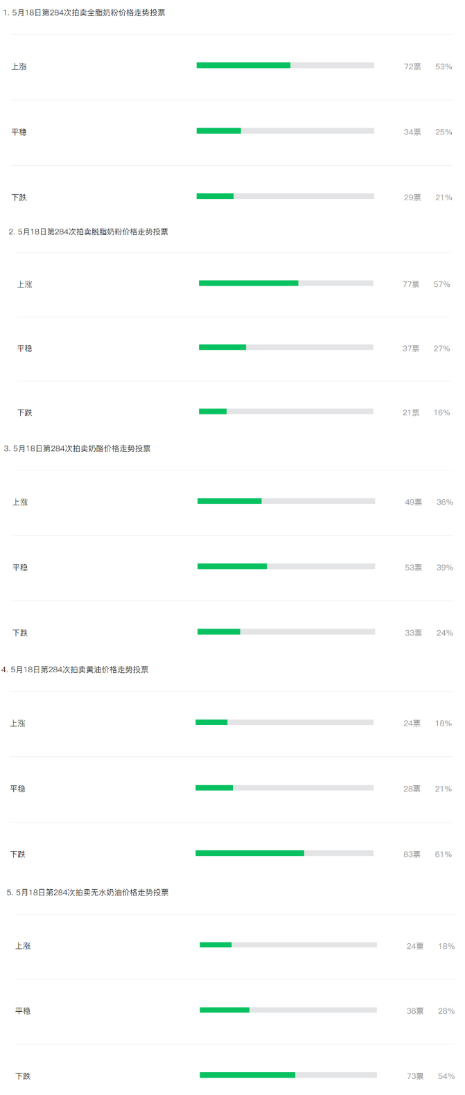 在5月18日第284次拍卖盘前分析中,我们发出了关于全脂奶粉、脱脂奶粉、奶酪、黄油、无水奶油价格走势预测的投票。投票结果如下:
