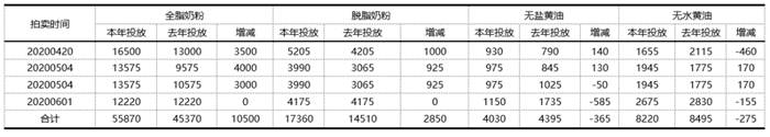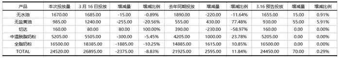 环比投放,产季末期,除奶酪上轮爆减后本轮有所反弹外,其它品种都有所萎缩,全脂奶粉缩量较多;同比去年,无水油和奶酪为投放主要减量,而前期大涨的黄油、全脂奶粉、脱脂奶粉成为增量主力;较上次拍卖预告比较,乳脂产品数量均有所增加。